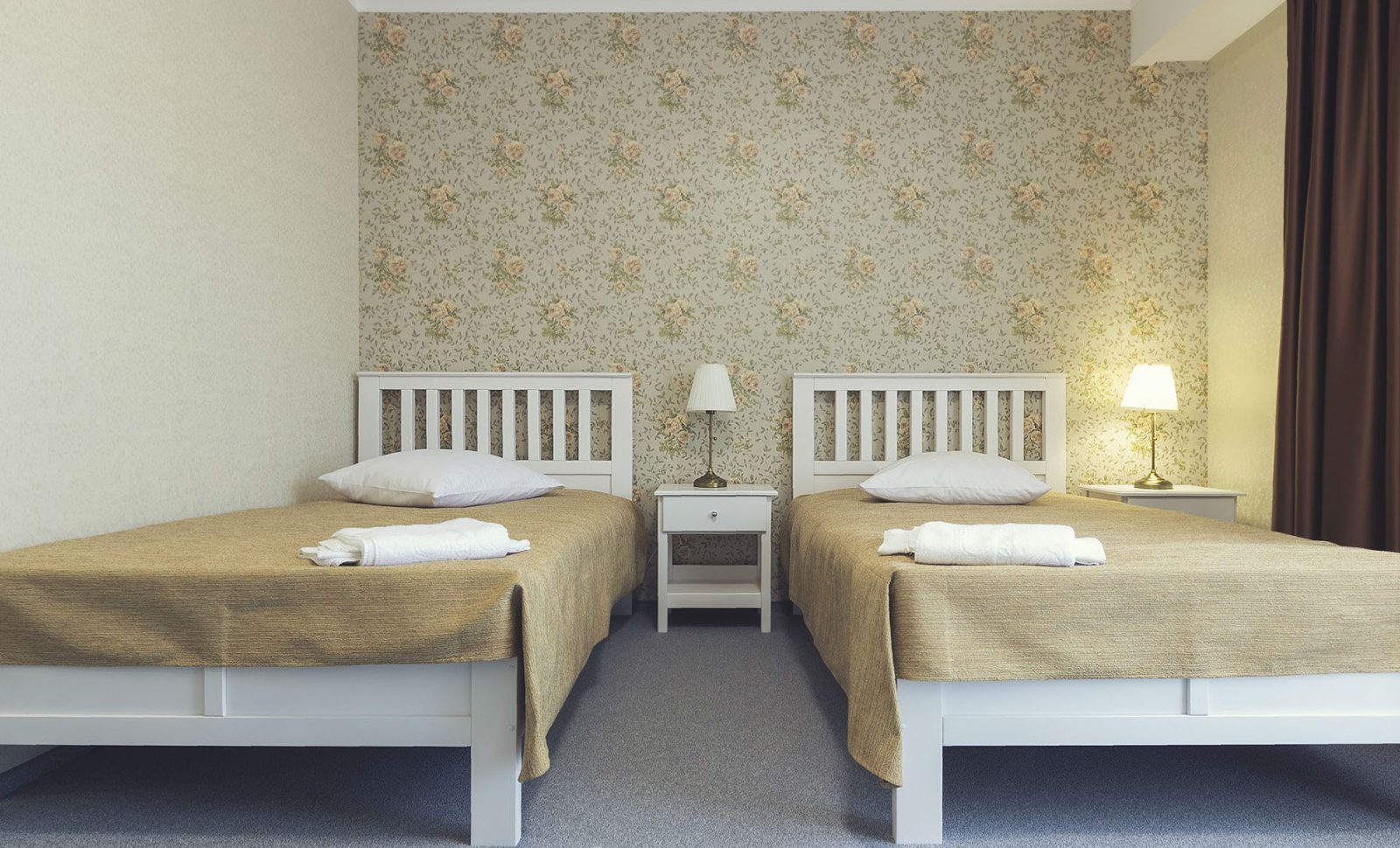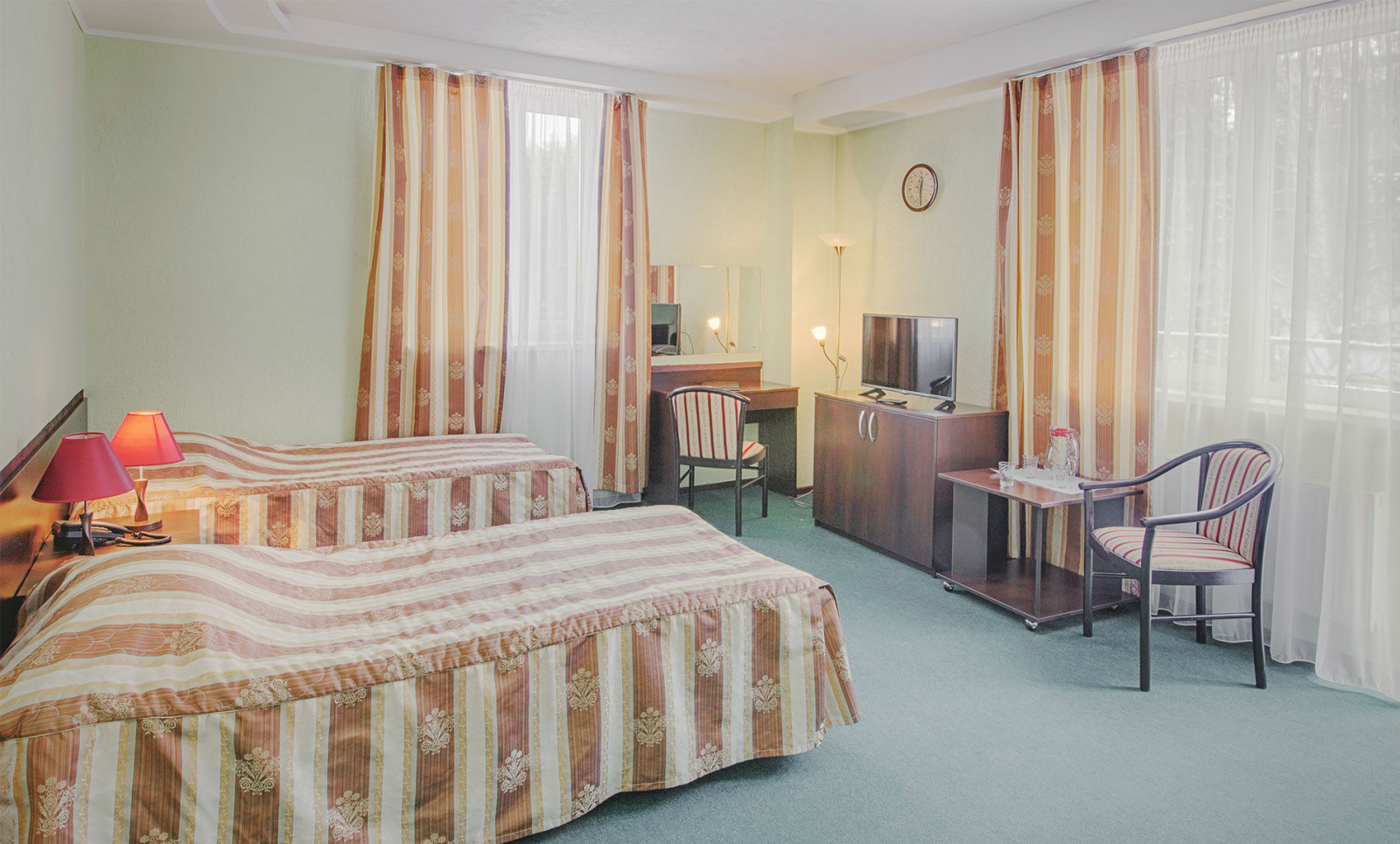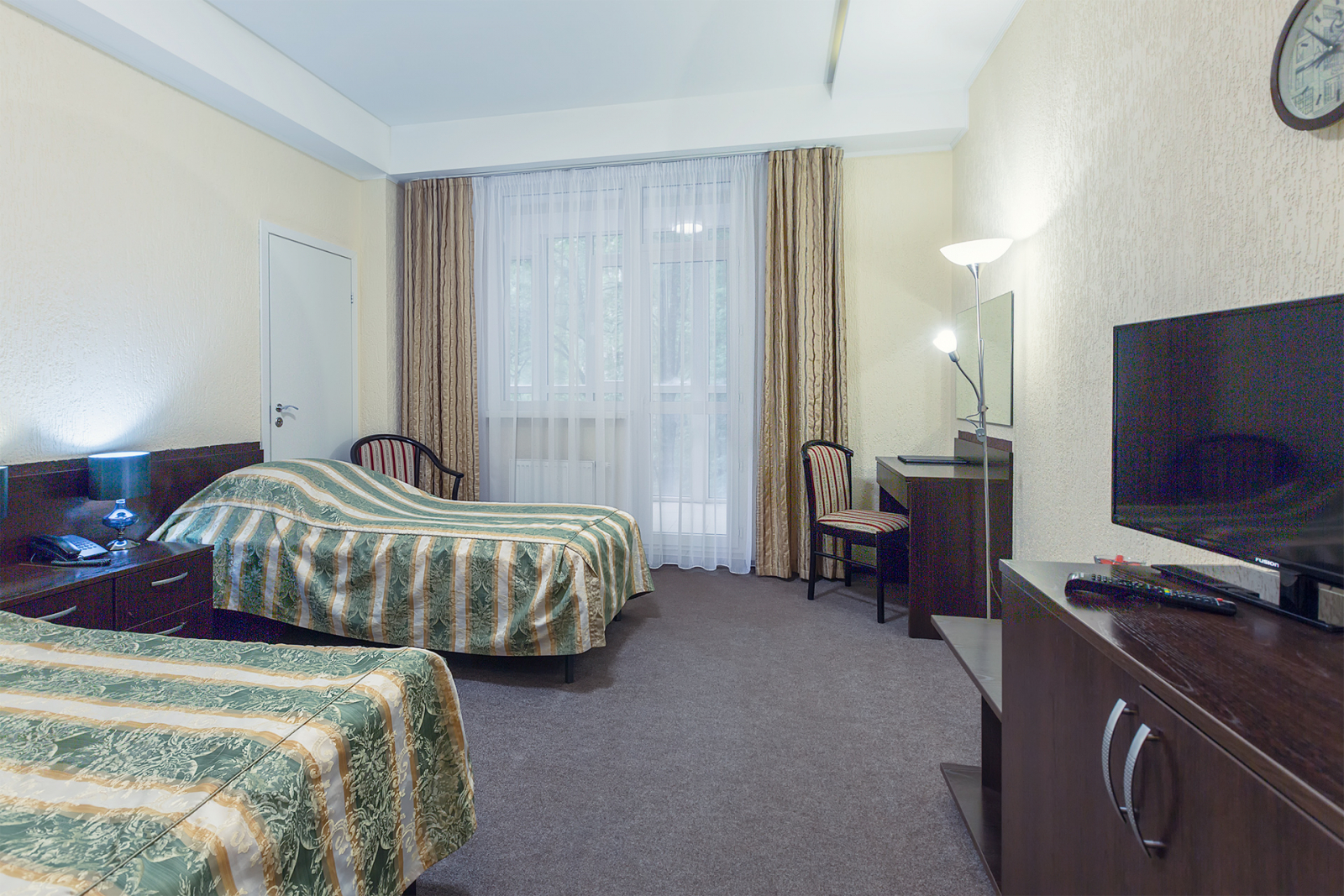 Площадь номера - 21 кв.м. 2 осн. места. 1 доп. место. Мебель: вешалка, зеркало, кровати односпальные /одна двуспальная кровать, прикроватные тумбочки, столик туалетный, стулья, шкаф-купе. Оборудование: сейф, телевизор, телефон, чайный набор посуды, электрочайник. Санузел: с душем, тапочки, туалетные принадлежности, фен, халат. Сервис: Wi-Fi бесплатно, смена полотенец, смена постельного белья, уборка номера.