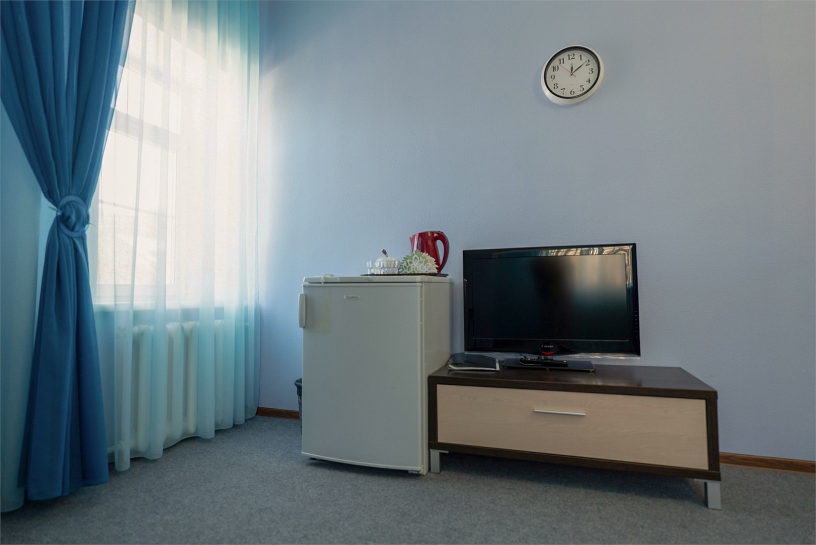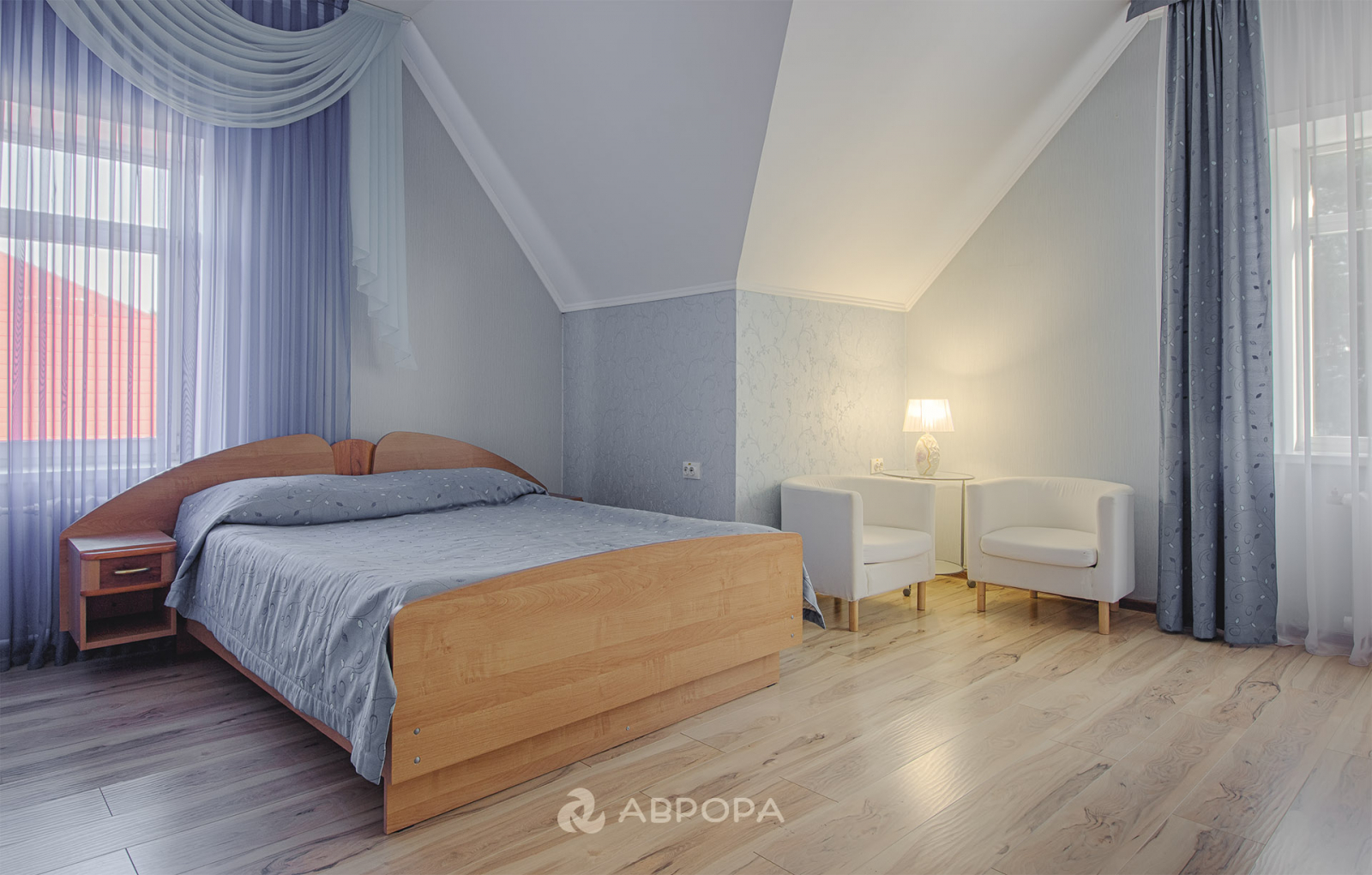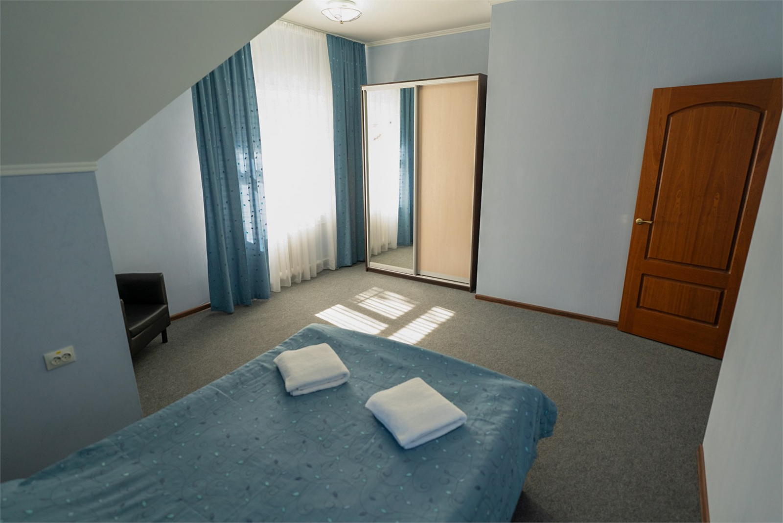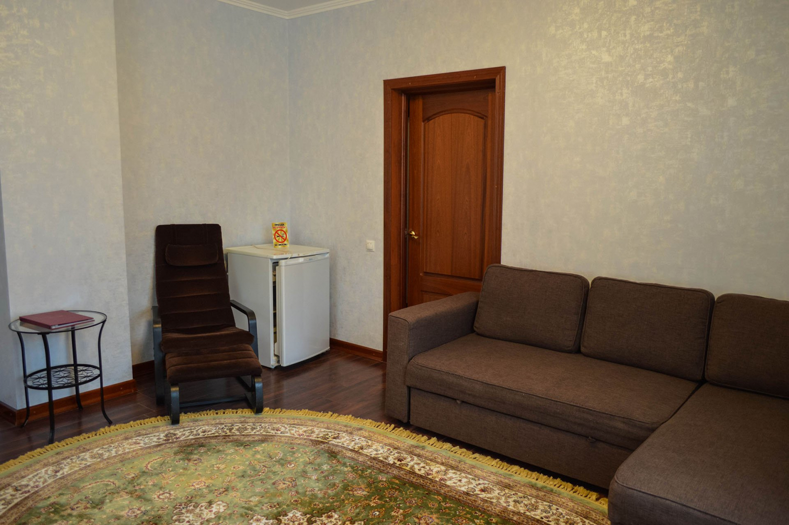 Площадь номера - 48 кв.м. 2 осн. места. 2 доп. места. Мебель: вешалка, диван раскладной, зеркало, кресла, кровать двуспальная, прикроватные тумбочки, столик журнальный, стул, шкаф, шкаф для посуды. Оборудование: кондиционер, сейф, телевизор, холодильник, чайный набор посуды, электрочайник. Санузел: с ванной/душем, тапочки, туалетные принадлежности, фен, халат. Сервис: Wi-Fi бесплатно, смена полотенец, смена постельного белья, уборка номера.