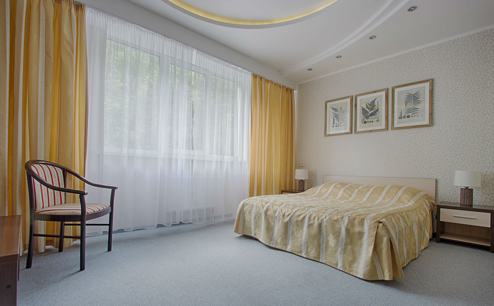 Площадь номера - 20 кв.м. 2 осн. места. 1 доп. место. Мебель: вешалка, зеркало, кровати односпальные /одна двуспальная кровать, прикроватные тумбочки, столик туалетный, тумба под телевизор, тумба под холодильник, шкаф-купе. Оборудование: мини-холодильник, сейф, телевизор ЖК, чайный набор посуды, электрочайник. Санузел: с душевой кабиной, тапочки, туалетные принадлежности, фен, халат. Сервис: Wi-Fi бесплатно, смена полотенец, смена постельного белья, уборка номера.