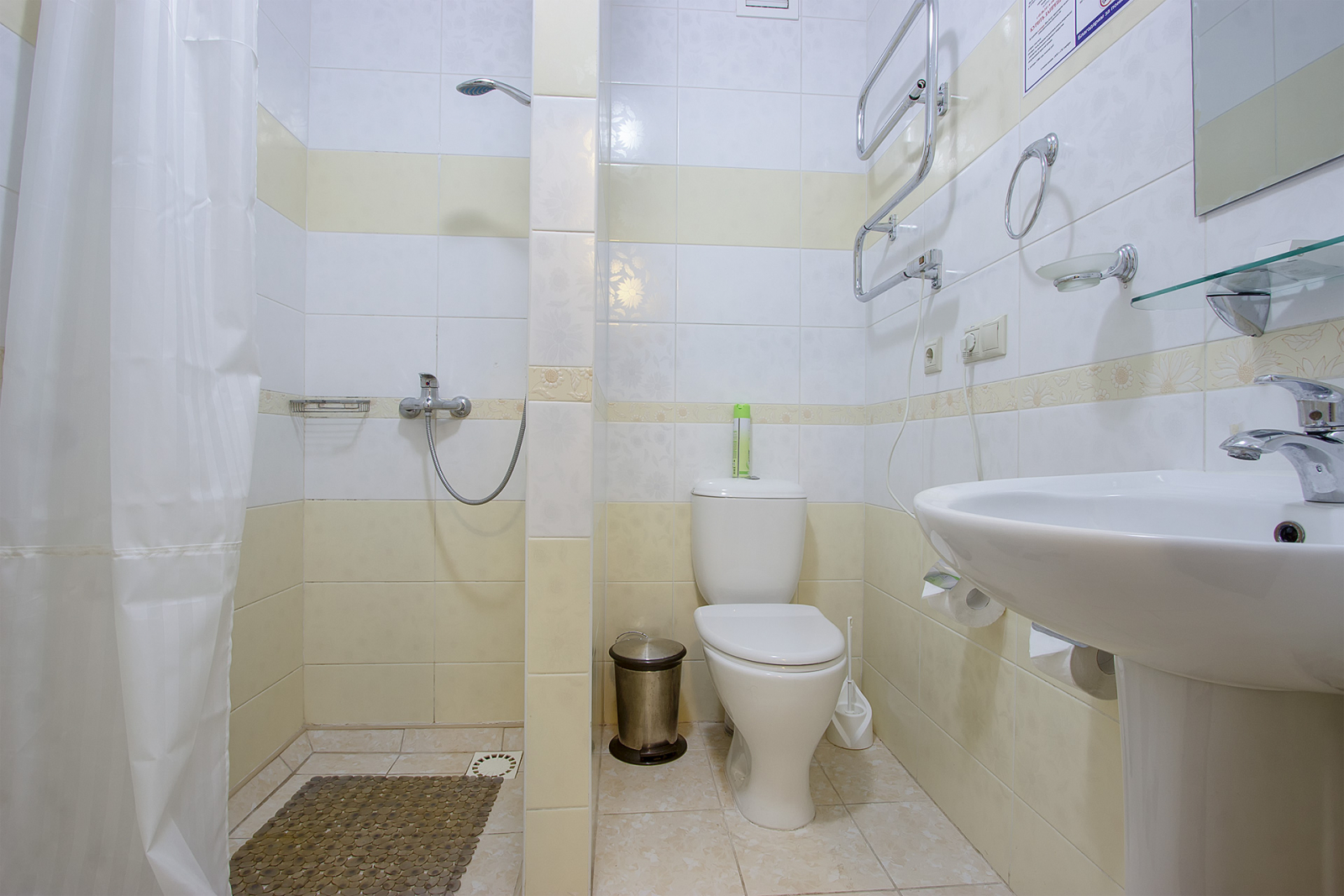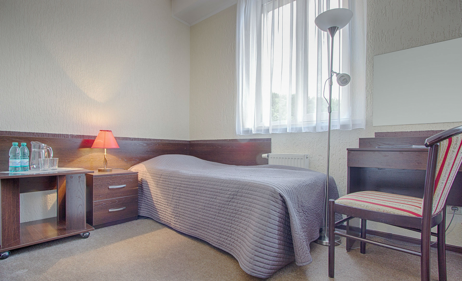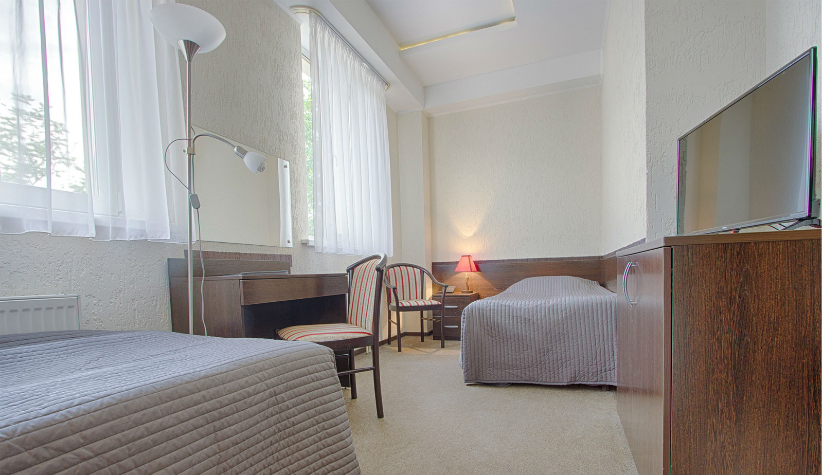 Площадь номера - 16 кв.м. 2 осн. места. Мебель: вешалка, зеркало, кресло, кровати односпальные, прикроватные тумбочки, столик журнальный, столик туалетный, стул, шкаф-купе. Оборудование: сейф, телевизор, телефон, чайный набор посуды, электрочайник. Санузел: с душем, тапочки, туалетные принадлежности, фен, халат. Сервис: Wi-Fi бесплатно, смена полотенец, смена постельного белья, уборка номера.