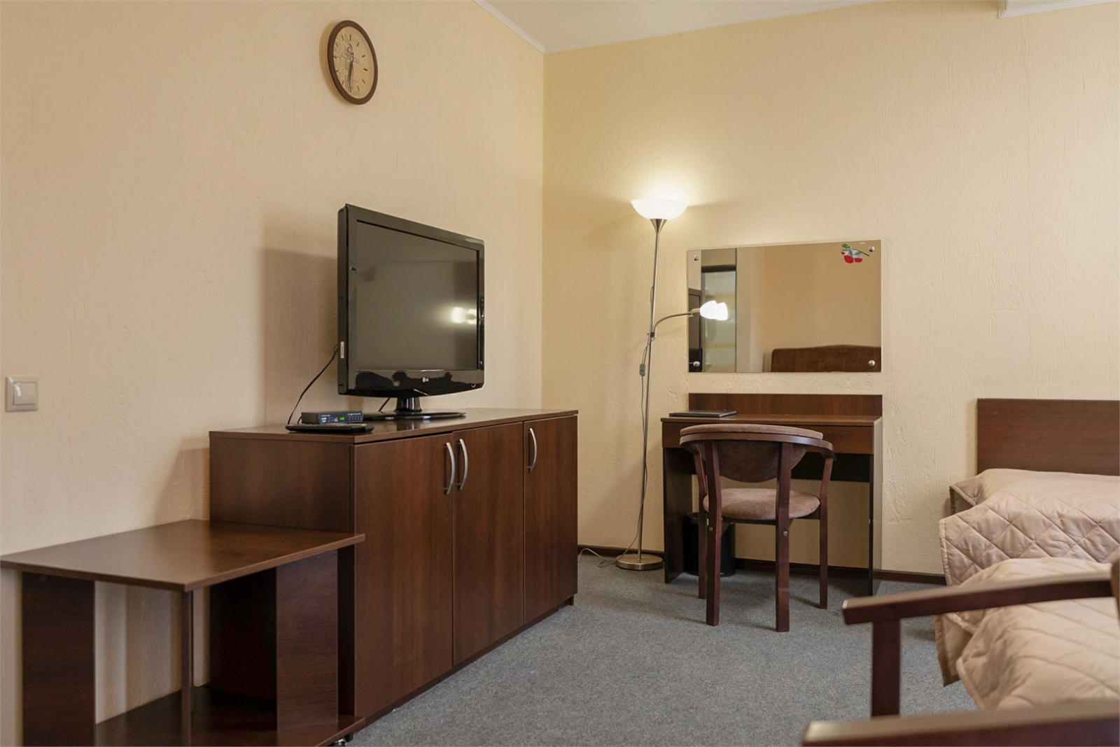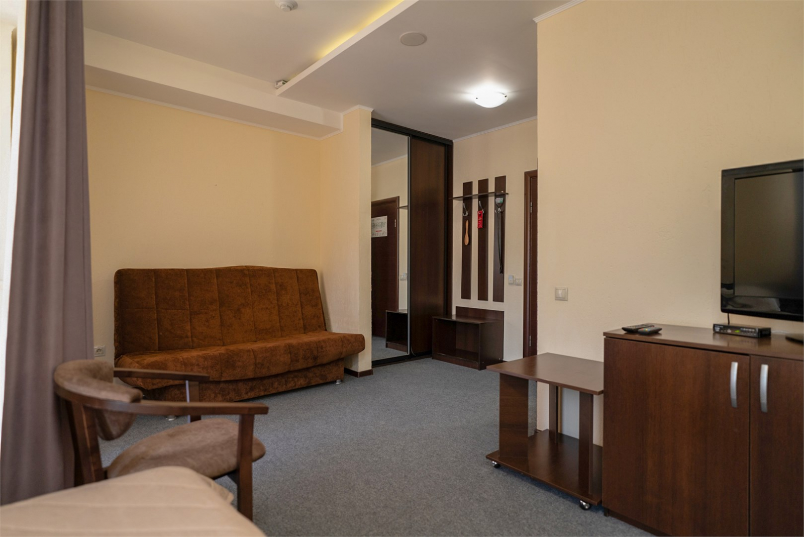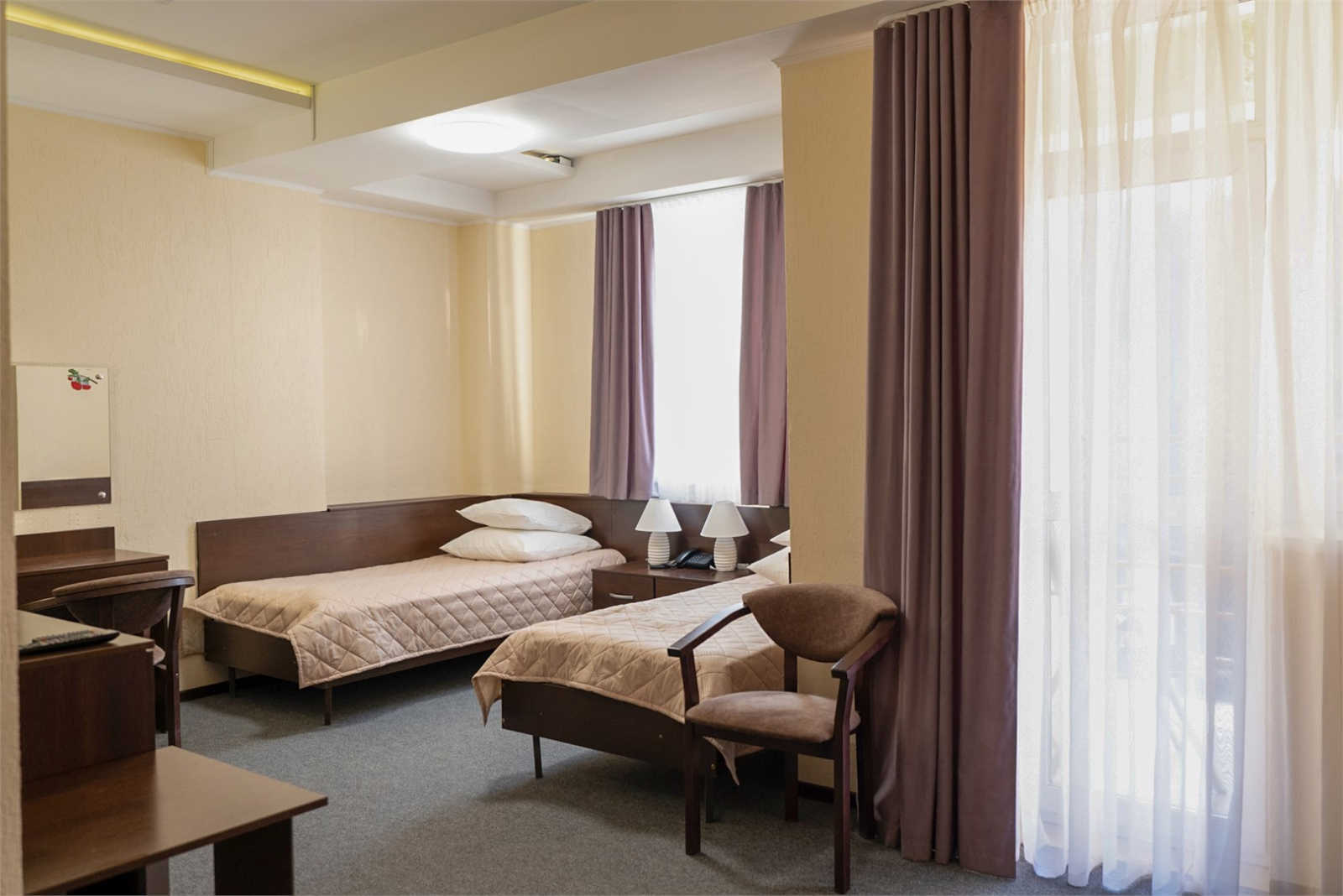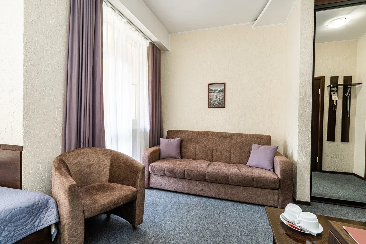 Площадь номера - 28 кв.м. 2 осн. места. 1 доп. место. Балкон. Мебель: вешалка, диван, зеркало, кресло, кровати односпальные, прикроватные тумбочки, столик журнальный, столик туалетный, стулья, шкаф-купе. Оборудование: сейф, телевизор, телефон, холодильник, чайный набор посуды, электрочайник. Санузел: с душем, тапочки, туалетные принадлежности, фен, халат. Сервис: Wi-Fi бесплатно, смена полотенец, смена постельного белья, уборка номера.